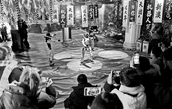 2月8日,游客在河北省秦皇岛市海港区新澳海底世界观看智能机器人舞蹈表演。