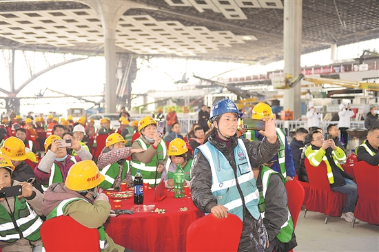 2月12日下午,在陕西重大基础设施项目——西安东站建设现场,陕西省建设工会为300余名春节期间坚守岗位的一线建设者,举办迎新春慰问活动,为他们表演了合唱、相声、杂技、魔术等文艺节目。图为建设者开心地拍摄演出节目。本报记者 祝盼 摄