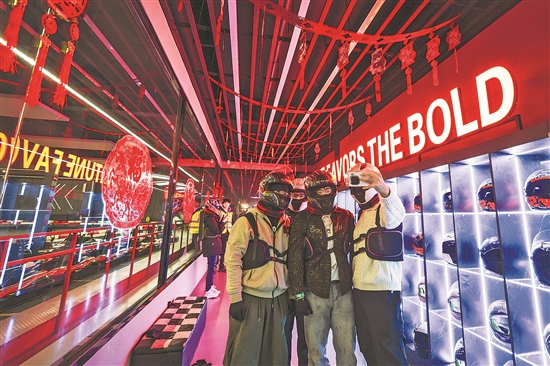 2月12日,游客在沈阳粮仓文化创意产业园准备体验室内卡丁车项目。