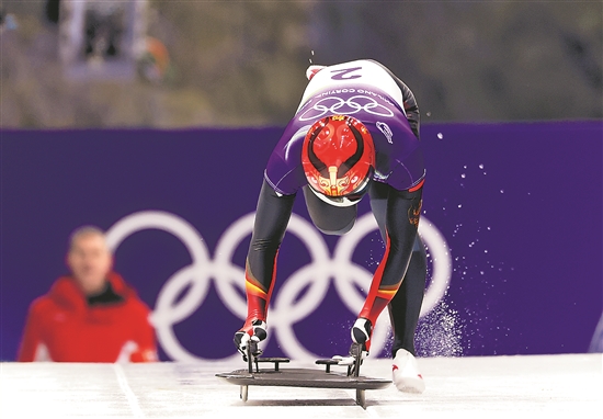 当地时间2月12日,米兰-科尔蒂纳冬奥会钢架雪车项目男子单人赛在意大利科尔蒂纳举行。图为中国选手殷正在第一轮比赛中,他在两轮比赛后暂时并列第八名。新华社记者 丁旭 摄