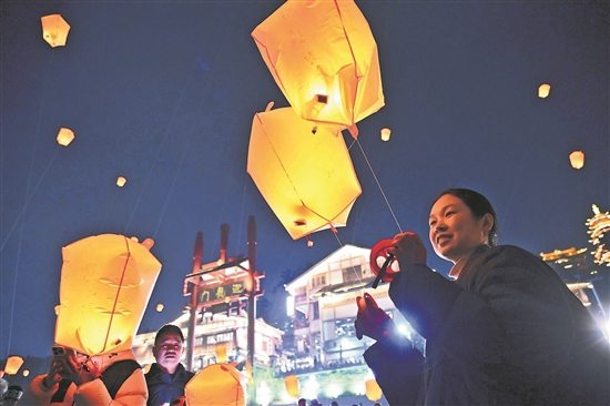 日前,重庆市沙坪坝区磁器口古镇码头广场,环保电子孔明灯腾空而起,点亮夜空,营造出梦幻般的沉浸式体验。当日,“磁有灵犀,马上有福”新春庙会在重庆磁器口千年古镇拉开帷幕。新春庙会期间,古镇白天呈现非遗快闪、民俗巡游、杂耍与特色美食汇聚的烟火气;入夜后,既有千人齐放孔明灯、火壶等传统启福活动,还推出了科技感十足的全息投影,让游客近距离感受科技的奇妙。