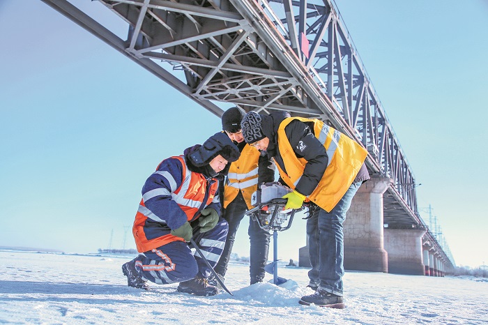 中国铁路哈尔滨局集团有限公司齐齐哈尔工务段水文测量组负责管内197座桥和400个涵洞的水文监测工作。每年春运,班组都要在铁路大桥的桥墩附近选取32个监测点,用钻冰机钻出深近1米的冰洞,用塔尺测量墩台基础冲刷、河床变化等基础数据,保证桥梁安全稳定。刘杨 摄