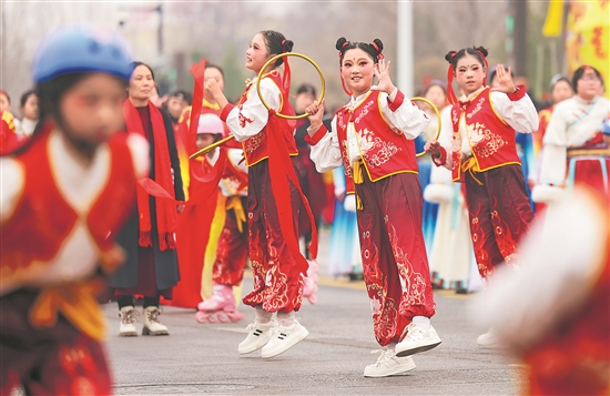 2月26日,河北省石家庄市灵寿县举办2026年新春民间艺术巡游展演活动,慈峪抬阁、得胜鼓、跑旱船、秧歌、高跷马等经典民俗节目轮番登场,十几支民间艺术队伍齐聚一堂,用地道的民俗风情为群众送上新春祝福。新华社发 (梁子栋 摄)
