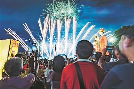 民众在新加坡“春到河畔”春节庆祝活动上观赏烟花表演。新华社发 (邓智炜 摄)