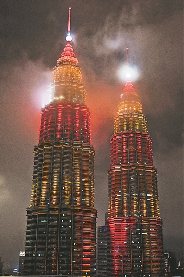 马来西亚国家石油公司双塔换上春节主题灯光迎接春节到来。新华社记者 程一恒 摄