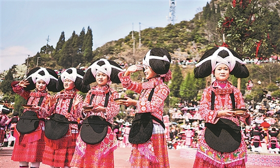 2月26日,在贵州省六盘水市六枝特区梭戛苗族彝族回族乡高兴村跳花场,苗族群众在演唱祝酒歌。