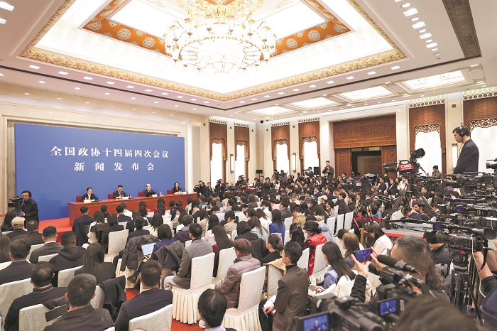 3月3日,全国政协十四届四次会议新闻发布会在人民大会堂举行。图为新闻发布会现场。本报记者 王伟伟 摄