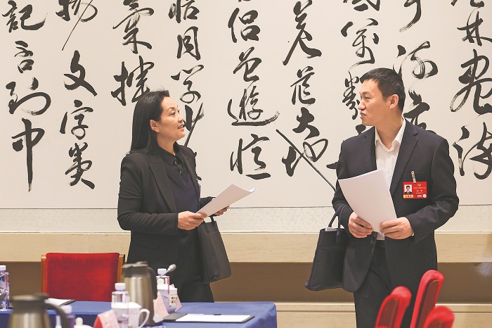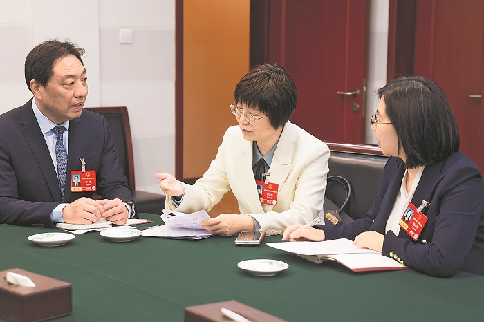 ②3月4日,全国劳模、中国兵器工业集团首席技师马秀丽委员(图左)和全国劳模、中国航天科技集团一院首都航天机械有限公司主任工艺师刘争委员,聚焦建功“十五五”,就产业升级中技能人才培育等话题深入交流。本报记者 王伟伟 摄