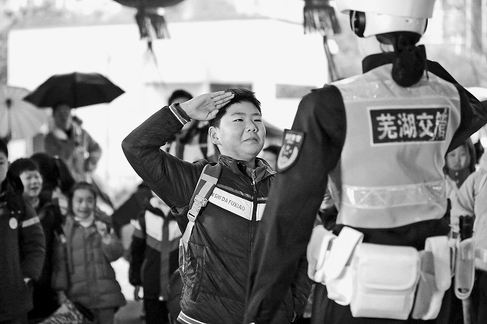 3月2日,安徽省芜湖市公安局交管支队首款“AI交警机器人”——芜优智警R001号走进芜湖市银湖小学。这款搭载AI大数据的机器人通过活泼的语言和生动的肢体动作与孩子们互动,将佩戴头盔、系好安全带等安全知识讲解得通俗易懂,让交通安全课变得趣味盎然。本报通讯员 陈效宝 摄