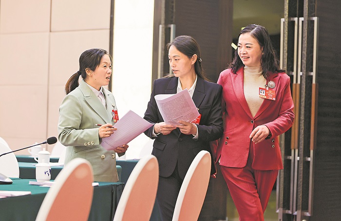 3月6日,在江西代表团驻地,江西贯胜鞋业有限公司营销部职员王花萍代表、九江鑫城纺织有限公司职工熊晓梅代表、九江市公共交通集团公司公交驾驶员张海荣代表(从左至右)在会后交流讨论。