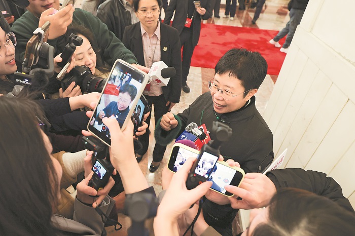 3月7日,全国政协十四届四次会议举行第二次全体会议。中央民族大学教授蒙曼委员在进入会场前接受媒体采访时说:“希望女职工能读好书、多读书,塑造更美的自己。”本报记者 王伟伟 摄
