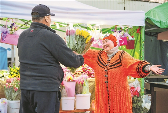 全球多地民众近日选购鲜花,庆祝“三八”国际妇女节。图为近日在哈萨克斯坦阿拉木图,一名女士接受献花。