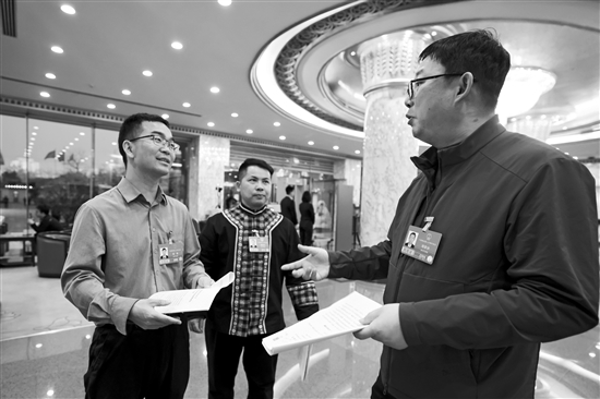 3月8日,乌江渡发电厂计划发展部副主任郑伟代表,中国邮政集团有限公司贵州省龙里县分公司投递员莫富元代表,南方电网贵州铜仁供电局变电智能作业班副班长、二级拔尖专业技术专家周敬余代表(从左至右),正在围绕贵州省的发展进行交流。