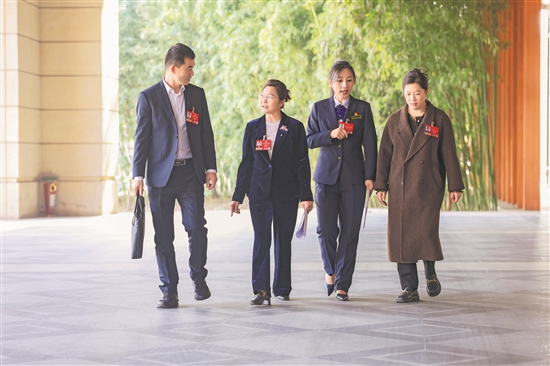 3月10日,在北京代表团驻地,中铁六局丰桥公司石家庄项目部副经理王足刚代表、石景山区环境卫生服务中心密闭式清洁站操作员刘明群代表、北京市首都公路发展集团有限公司京开高速公路管理分公司青云店收费管理所收费班长王争代表、北京七一八友晟电子有限公司质量工程师管文会代表(从左至右)在前往会场时进行交流。
