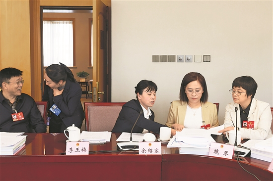 3月10日,四川省代表团小组讨论结束后,四川恒通动保生物科技有限公司散剂车间班组长李玉梅代表(右三)、四川省北川羌族自治县擂鼓镇五星村党支部书记余绍容代表(右二)和宜宾学院教授魏琴代表(右一)继续交流讨论。余绍容代表认为,当前人工智能正以前所未有的速度重塑生产生活方式,已深度融入千行百业。