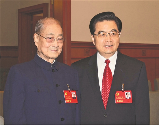 2007年10月21日,在党的十七大闭幕前,胡锦涛同志同宋平同志在一起。新华社发