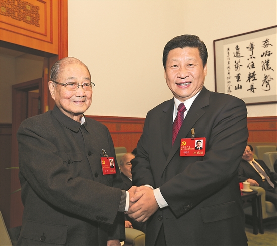 二〇一二年十一月十四日,在党的十八大闭幕前,习近平同志同宋平同志在一起。新华社发