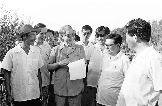 1990年7月中下旬,宋平同志(前左二)来到内蒙古自治区巴彦淖尔市临河区马场地村了解基层党支部建设情况。新华社记者施长江 摄