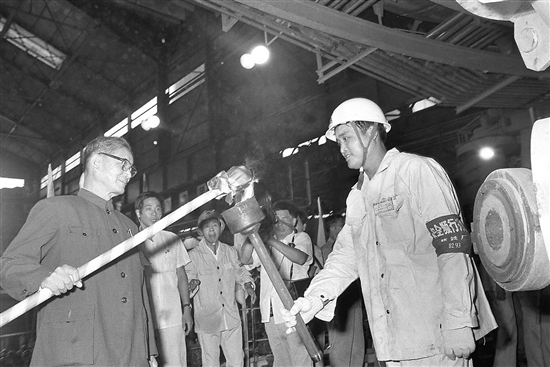 1985年9月15日,我国第一座日产万吨铁的高炉——宝钢一号高炉点火试生产。这是宋平同志(左一)为高炉点火。新华社记者