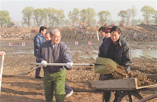 1991年11月13日,宋平同志(左)来到北京市通县(今通州区)张家湾凉水河整治工程工地参加劳动。新华社记者刘建国 摄