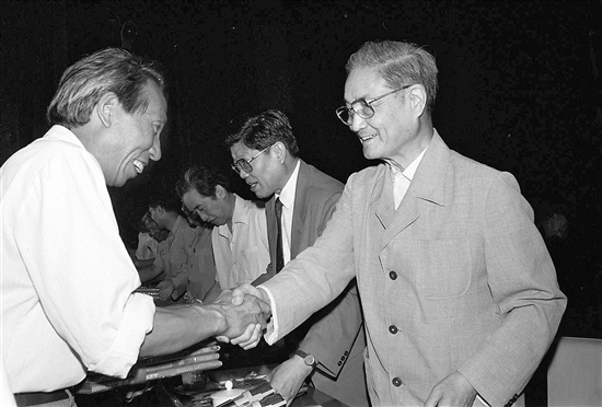 1991年6月26日,中共中央组织部、中共中央宣传部等单位在北京召开大会,表彰全国高校优秀思想政治工作者。这是宋平同志(右)向获奖的个人颁奖。 新华社记者张燕辉 摄