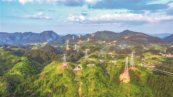 ②“疆电入渝”特高压工程重庆段输电线路翻越绵延群山。国网重庆市电力公司供图