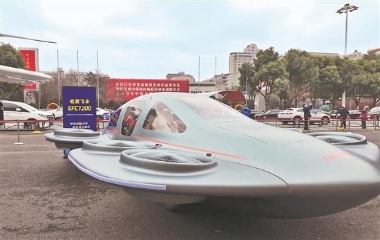 ④今年湖北“新春第一会”展示现代化“飞车”——全球首创全涵道式吨级“飞碟”电鹰飞车。本报记者 张翀 通讯员 周世玮 摄
