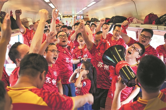 ①2025年夏天,“苏超”爆火。“苏超专列”上,球迷正齐声呐喊助威。本报记者 刘金梦 摄