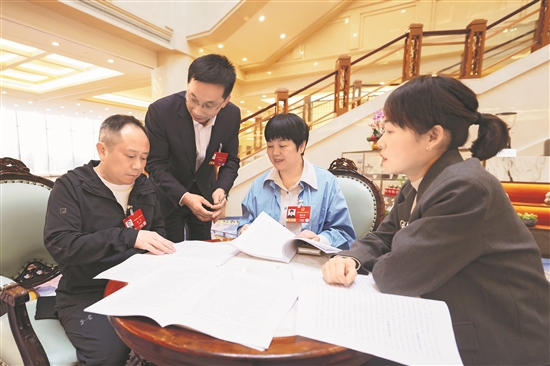 3月11日,在湖南代表团驻地,湖南中医药大学第一附属医院儿童医学中心主任张涤代表、湖南省常德烟草机械有限责任公司高级技师符国强代表、醴陵市醴泉窑艺陶瓷有限公司总设计师(艺术总监)黄小玲代表、中国兵器工业集团有限公司江南工业集团有限公司特级技师彭小彦代表(从左至右)就“产教融合”的话题进行交流。