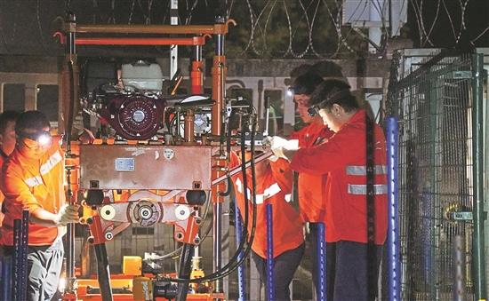 春运期间,正值钢轨防断期,国铁南昌局龙岩工务段探伤工在铁山洋站操作钢轨探伤仪,细致排查站场设备隐患,用专业与坚守保障来往列车安全平稳运行。