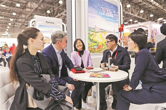 当地时间3月11日至13日,2026年莫斯科国际旅游与酒店业展览会(MITT)在莫斯科举行。中国展台在开幕日举行“中国旅游推介日”活动,集中展示推介丰富多样的旅游资源和产品。图为中国参展企业与客户交流。 田冰 摄/视觉中国 供图