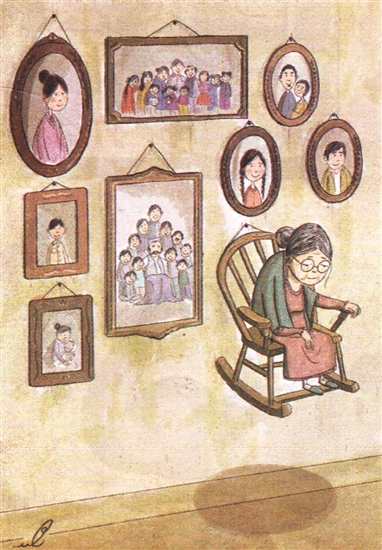 墙壁上装饰着格式镜框,无疑是一家人的大聚会,奇怪的是这里还悬挂着一位无人照料的耄耋老人,众多的儿女现在在哪里?