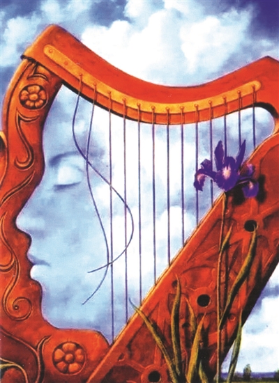 竖琴音色之美常比天籁,亦如少女靓丽歌喉。今日漫画家又把琴弦喻为姑娘秀发在衬蓝天背景,更平添几分动人情怀。