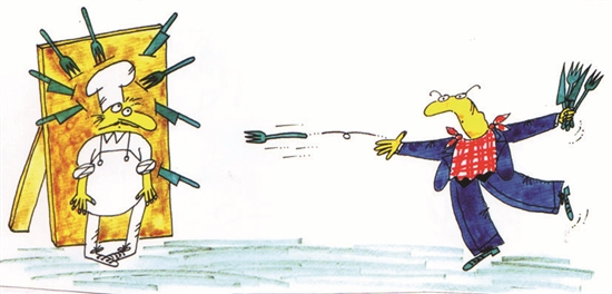 厨师与食客都在展示自家的“绝招”。前者用鲜美的菜肴引人垂涎;后者临场发挥投掷手段更是震惊所有来宾。