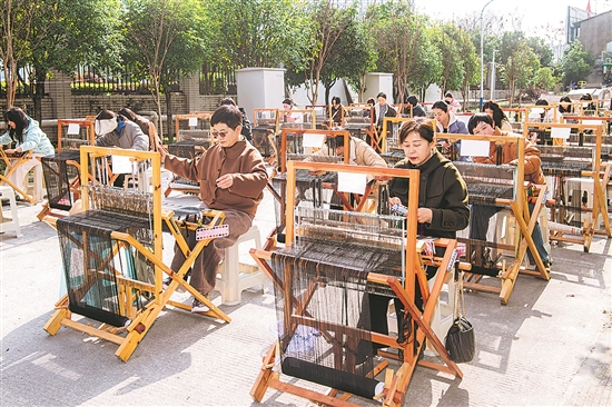 日前,湖北恩施,众多女性游客在体验国家级非物质文化遗产——土家织锦“西兰卡普”的制作技艺。她们围坐在传统木织机前,学习穿梭引线,感受指尖上的非遗魅力。此次活动不仅丰富了游客的文化体验,也促进了土家族传统手工艺的传播与传承。视觉中国 供图