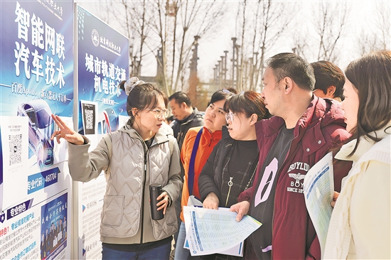 3月15日,北京科技职业大学校园内,工作人员正在为学生家长介绍学校专业建设与招生详情。