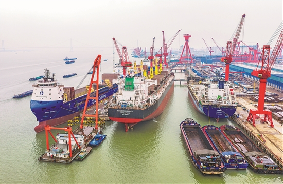 图为在江苏省泰州市高港区的泰州三福船舶工程有限公司生产基地,多艘大型船舶在建造中。