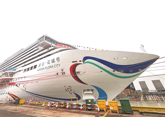 “爱达·花城号”邮轮总吨位达到14.19万吨。与首艘国产大型邮轮“爱达·魔都号”相比,“爱达·花城号”邮轮在设计和建造上进行了诸多改进。新华社记者 丁汀 摄