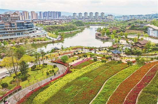 3月18日,游客在重庆市璧山区古道湾公园游玩(无人机照片)。近年来,璧山区持续扮靓城市空间,让市民与游客尽享生态与人文交融之美。