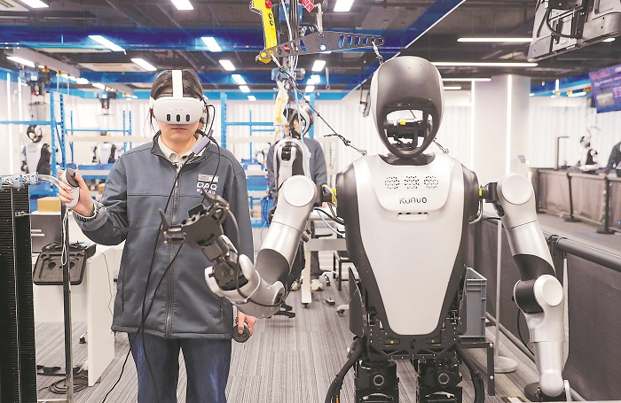 3月18日,青岛市人形机器人数据采集训练场,2004年出生的马倩,在指导机器人模拟工厂PCB板上料。