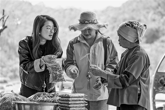 3月17日,村民(右一)在坝美景区向游客展示当地特产和手工艺品。