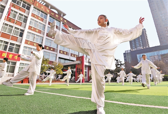 3月21日,首个“国际太极拳日”到来。图为河北省邯郸市邯山区实验小学的学生们在操场上练习太极拳。郝群英 摄/中新社