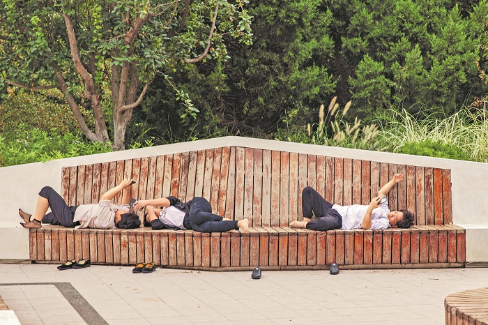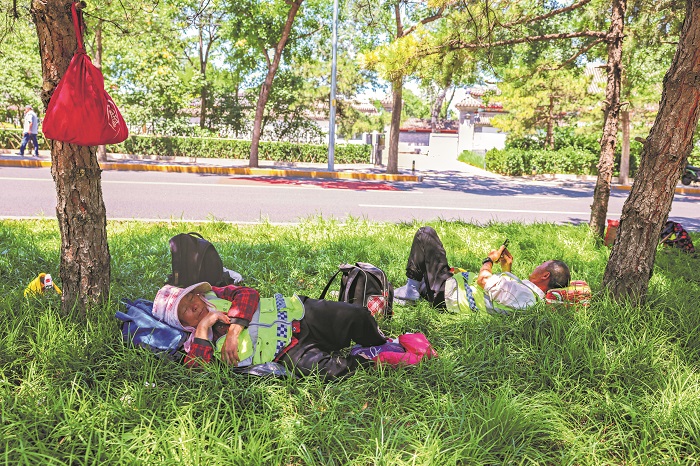 2023年8月23日下午5时,北京的一处公园内,附近餐厅的工作人员正在长凳上休息。本报记者 王伟伟 摄