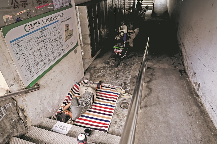 2025年8月12日,北京的一处老旧小区内,装修工正在过道内午休。本报记者 王伟伟 摄