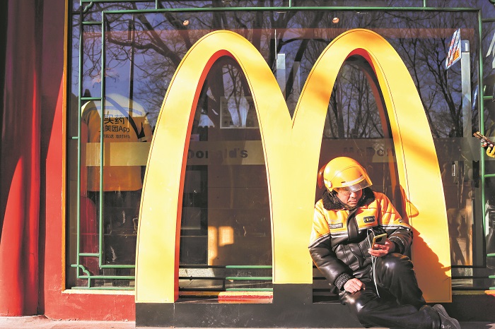1月21日,北京一快餐店外,外卖骑手在等餐过程中靠窗休息。本报记者 杨登峰 摄