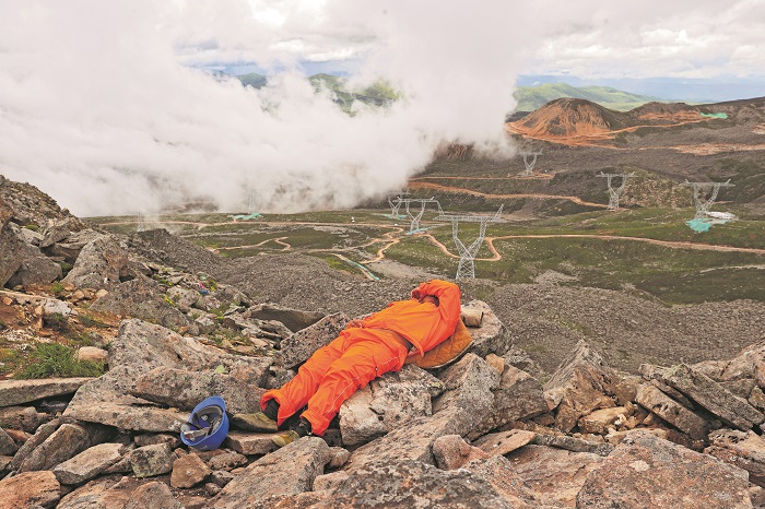 2024年7月16日,在四川省甘孜藏族自治州康定市折多山川渝1000千伏特高压交流工程线路工程1R060号铁塔组立现场,一名工人躺在石头上午休。川渝1000千伏特高压交流工程线路工程(2标段)全线平均海拔4224米,是连接四川、重庆的电源和负荷中心的电力高速路。本报记者 吴凡 摄