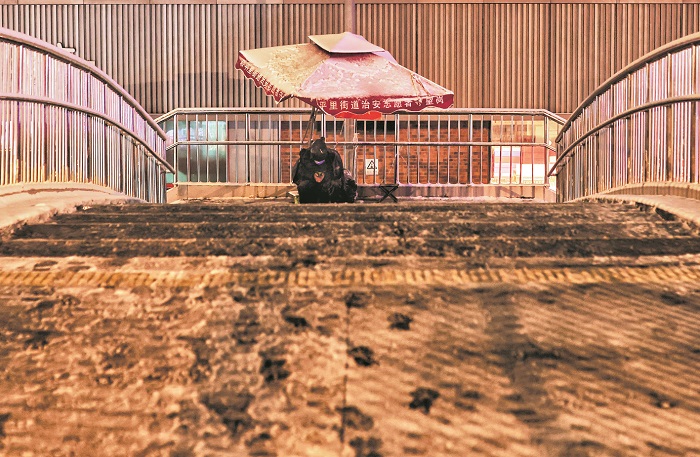 3月4日晚上11时36分,北京一过街天桥上,在雪夜执勤的保安。本报记者 杨登峰 摄