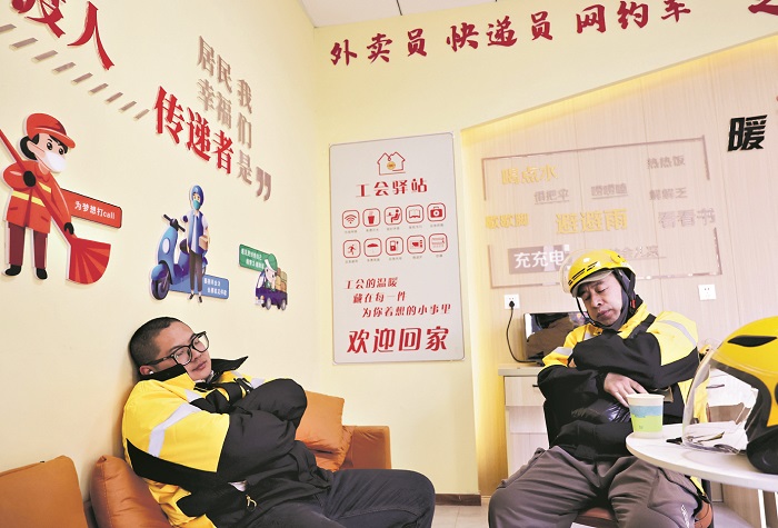 3月18日下午,安徽省淮北市相王广场,外卖骑手在工会驿站小憩。近年来,淮北市总工会为户外劳动者提供多元有效、贴心细致的暖心服务,已建成工会驿站370家,初步形成户外劳动者“15分钟暖心服务圈”。本报通讯员 张锋 摄