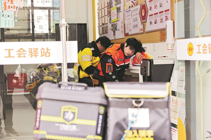 3月19日,河北石家庄,赵佗路街道明珠花苑工会驿站内,外卖骑手利用订单间隙打盹补觉。本报通讯员 杨磊涛 摄