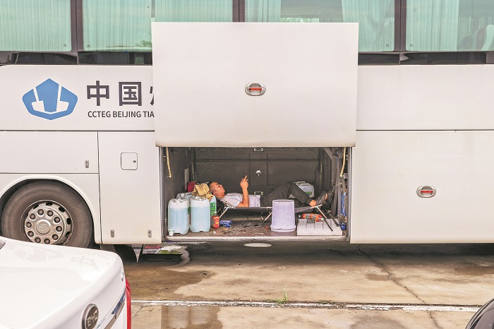 2025年7月10日,北京一停车场内,等候乘客的大巴车司机在货仓内避暑休息。本报记者 吴凡 摄